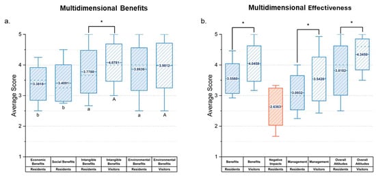 The average scores and standard deviations of survey responses. (a) Each category of benefits (economic, social, intangible, environmental). (b) Four aspects investigated in this study (benefits, negative impacts, management, and overall attitudes). The box charts above and below the average score (solid line) with the standard deviation (box range) of responses for four categories of benefits and the fields of benefits, negative impacts, management, and overall attitudes in resident- and visitor-oriented surveys. Whiskers indicate the 5% to 95% percentile of responses; dotted lines within the boxes indicate the median. In the same version of the questionnaire, letter notation is used to label the differences between responses regarding each benefit, where those with different letters have statistically significant differences, and those with the same letter have no significant differences at a 95% significance level. Asterisks indicate differences between two versions of the answer to the same field at a 95% significance level. A score of 1 to 5 on this scale corresponds to a progression from strongly disagree to disagree, neutral, agree, and strongly agree. Negative impacts were rated higher than three points, indicating agreement that there were adverse impacts.