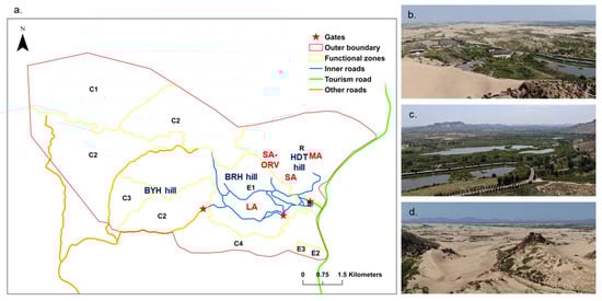 Additional information on BLK and scenes captured during the on-site survey (photo credit: author). (a) A map of interior BLK (scenic areas), the internal and outer roads, and gates. Visitor tours of BLK are divided into three routes (scenic areas) with the themes of sand, lakes, and mountains: (1) the sand area (SA) belongs to the area to the north of the park’s central square, including most of the sandhill Haodaotu Wula (HDT hill) and the dune area behind it; (2) the lake area (LA) consists of the scattered lakes and surrounding area on the south side of sandhill Borenghai Wula (BRH hill) and the east side of sandhill Baiyinhan Shan (BYH hill); and (3) the mountainous area (MA) is the region with bare rocks concentrated on the east slope of HDT hill. The inner park roads (blue lines) are concentrated in the original functional Zones E1, S, and R. There is no exact zoning, but the approximate range of the scenic areas is shown by dotted circles. LA is the area surrounded by the ring road in Zone E1. The branch roads extending to the sandy areas with ends from west to east lead to the area under construction (not yet open), the park’s official off-road vehicle playground (SA-ORV), and MA. The green line shows a section of the dedicated tourism road from the county center to BLK in Figure 1b. The orange lines indicate the main roads outside the current attraction but end within the scope of the NDP declaration, in which the one on the east side points to the park’s west gate (locked), and those on the middle and south side point to the dune area. The stars mark the three gates of the park, of which only the one in Zone S is open to the public as the front entrance. (b) A photograph of the line from the parking lot outside the park—the main entrance—the central square inside the park, which is the main part of the current park service area, including ticket offices, hotels, restaurants, a theater, area for children’s amusement, the central station of internal transportation, and rest areas. (c) A photograph of the main body of LA and its southwest extension. (d) A photograph of the dune area to the north of the valley between BYH hill and BRH hill, which is connected to SA-ORV to its east.