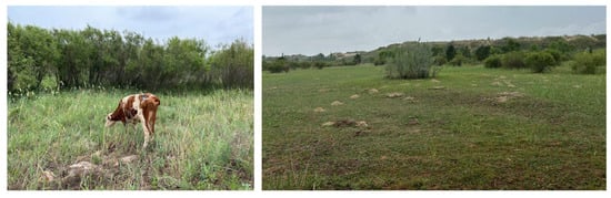 Evidence of livestock grazing in the park (photo credit: authors). Left: cattle grazing. Right: grass cropped by grazing.