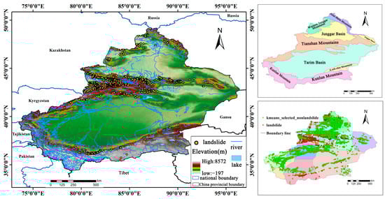 Located in the heart of the Asian continent (73.0° E–96.3° E, 34.1° N–49.2° N), Xinjiang is characterized by a complex topography dominated by the Altai Mountains in the north, the Tianshan Mountains in the center, and the Kunlun Mountains in the south (Figure 1). The Junggar and Tarim Basins are situated between them. The region lies within a tectonically active zone with well-developed fault structures, including the Tarim, Tianshan, Junggar, and Altai Blocks, which contribute to frequent geological hazards, particularly landslides. The geological composition consists mainly of Paleozoic and Mesozoic sedimentary, metamorphic, and volcanic rocks, further exacerbating landslide susceptibility. Additionally, seismic activity along the Tianshan and Kunlun Mountain belts increases the risk of geological movements. Given the high frequency of landslides in the region, a comprehensive assessment of landslide susceptibility is crucial for disaster prevention and mitigation [34].