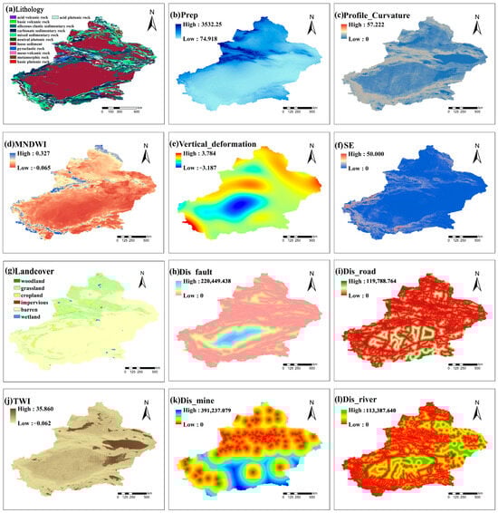 The data used in this study were derived from various sources to ensure accuracy and reliability. Elevation data were obtained from the Geospatial Data Cloud (https://www.gscloud.cn/, accessed on 25 February 2025). The slope, profile curvature (Figure 2c), Topographic Wetness Index (TWI) (Figure 2j), Topographic Roughness Index (TRI), and aspect data were calculated from elevation data using the ArcGIS platform. Data on landforms were downloaded from the Institute of Geographic Sciences and Natural Resources Research, Chinese Academy of Sciences (https://www.resdc.cn/, accessed on 25 February 2025). Depth to bedrock was sourced from the ISRIC database (https://www.isric.org/, accessed on 25 February 2025). Lithology (Figure 2a) and landcover (Figure 2g) were obtained from the USGS Earth Science and Environmental Change Science Center (https://www.usgs.gov/, accessed on 25 February 2025). Data on faults (Figure 2h) came from the 1:2,500,000 scale Digital Geological Map of the People’s Republic of China, available from the Geological Science Data Publishing System (http://dcc.ngac.org.cn/, accessed on 25 February 2025). River (Figure 2l) and road (Figure 2i) data were retrieved from OpenStreetMap (https://www.openstreetmap.org/, accessed on 25 February 2025). Mining (Figure 2k) data were sourced from the Global Disaster Database (https://www.gddat.cn/, accessed on 25 February 2025). Fault, river, road, and mining data were imported into ArcGIS10.8, where Euclidean distance tools were used to generate distance raster layers. Prep (Figure 2b) was downloaded from the PANGAEA Data Publisher (https://doi.pangaea.de/, accessed on 25 February 2025) and used to calculate the maximum daily precipitation for each raster using the Python3.12 platform. The Normalized Difference Bare and Built-up Index (NDBBI) [37], the MNDWI (Figure 2d) [38], and the Normalized Difference Vegetation Index (NDVI) were calculated using Landsat 8 remote sensing imagery on the Google Earth Engine platform. The annual maximum NDVI, the average NDBBI, and the MNDWI from 2013 to 2019 were derived. Vertical_deformation (Figure 2e) was downloaded from the National Earth System Science Data Center (http://www.geodata.cn, accessed on 25 February 2025) and converted from point data to raster format using ArcGIS. Soil erosion (SE) (Figure 2f) [39] was obtained from the Zenodo database (https://zenodo.org/, accessed on 25 February 2025).
