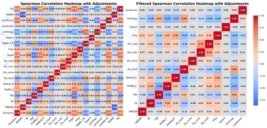 A Spearman’s correlation coefficient greater than 0.5 indicates a significant correlation [40]. LCFs exhibiting a Spearman’s correlation coefficient above this threshold are considered strongly correlated, and they are excluded to avoid multicollinearity. In Figure 4, the left figure shows the correlation coefficients of 20 factors before screening, and the right figure shows the correlation coefficients of the remaining 13 factors after removing the factors with a correlation greater than 0.5. Based on the correlation heatmap and the ranking of LCFs according to the Spearman’s correlation coefficient, we sequentially excluded six LCFs: Slope, Landforms, Depth_to_Bedrock, TRI, Elevation, and NDBBI.