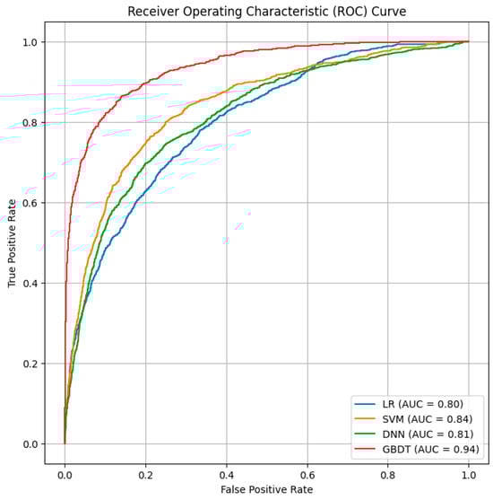 In the comparison of the AUC values of the four models, all values exceeding 0.80 indicate that all models exhibit good predictive performance (Table 3). Specifically, the AUC value for the GBDT model is 0.937, the DNN model is 0.807, the SVM model is 0.842, and the LR model is 0.802. The GBDT model outperforms the second-best performing SVM model by 11.28%, suggesting that it offers higher predictive accuracy. The higher performance of the GBDT model can be attributed to its ability to capture complex non-linear relationships between the features, which is a strength of gradient boosting methods. Moreover, Figure 5 shows that the area under the ROC curve of the GBDT model is the largest.