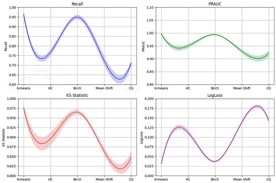 The non-landslide sample points were selected using k-means clustering, HC, BIRCH clustering, and mean shift clustering, and then combined with the GBDT model. After performing 10-fold cross-validation, the performance was evaluated using metrics including recall, AUC, PRAUC, KS statistic, and LogLoss to select the best method. In the Table 4, “CG” represents the control group. The model performance follows the order of k-means → BIRCH → HC → mean shift → CG. The k-means and BIRCH models have a LogLoss value of less than 0.1; a KS statistic greater than 0.9; and a PRAUC greater than 0.95. The standard deviation controlled within 102, indicating good model performance. Furthermore, the recall value for the control group is only 0.711, indicating that, when non-landslide points are selected randomly and the positive–negative sample imbalance exists, the model performs poorly in identifying landslide samples. However, by selecting non-landslide points using clustering methods while maintaining the positive–negative sample ratio, the recall improves significantly to 0.963, which alleviates the sample imbalance issue. In addition, Figure 6 illustrates the performance of the GBDT model under different non-landslide sample screening methods, along with the standard deviation (std). Figure 6 shows that, among the five non-landslide sample screening methods, the k-means method is the best.