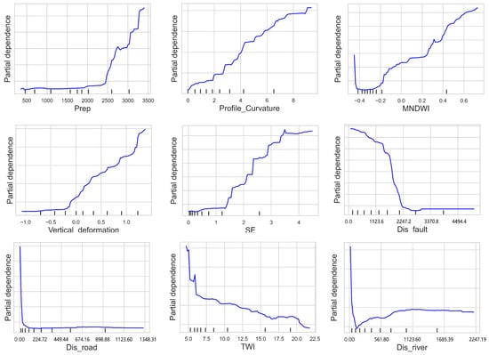 While the GBDT captures nonlinear patterns effectively, its interpretability relies on post hoc tools, like partial dependence plots (PDPs), which face three key constraints. First, PDPs assume feature independence when estimating marginal effects, oversimplifying collinear relationships (e.g., rainfall–soil permeability interactions) common in geospatial data. This can lead to an erroneous attribution of synergistic effects to individual factors [75]. Second, the GBDT’s sensitivity to hyperparameters (e.g., tree depth) amplifies the PDP’s instability, as minor parameter adjustments may drastically alter interpretation outcomes [76].