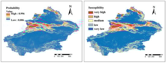 Finally, the trained model was applied to the Xinjiang region to generate a landslide susceptibility map. To ensure the reliability of the prediction results, actual landslide data were used for validation, including a rationality test, and a spatial accuracy assessment of the predictions was conducted. Furthermore, the prediction results were compared with previous susceptibility maps to assess improvements in classification accuracy and spatial distribution consistency.