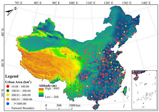 Since 2015, China has surpassed other countries in the world to become the country with the largest urbanization area and diversified urban scale [,,]. China spans a wide range of climate and latitude zones, from tropical, to cold, to temperate; meanwhile, China also has a wide range of altitude spans, with the Qinghai–Tibet Plateau being the highest altitude region in the world [,]. Therefore, China is an ideal research area for this study (Figure 1).