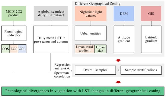 In addition, previous studies have shown that compared to air temperature, LST may have a more direct effect on vegetation phenology, just as it affects vegetation physiological characteristics []. Therefore, we fitted the LSTs and air temperatures of the two seasons within 259 urban agglomerations to supplement the evidence for selecting LSTs as the study data (Figure A2). The air temperature data were obtained from the Institute of Geographic Sciences and Natural Resources Research, CAS, Resource and Environment Science and Data Center (https://www.resdc.cn (accessed on 7 December 2024)). The workflow of our study is shown in Figure 2.