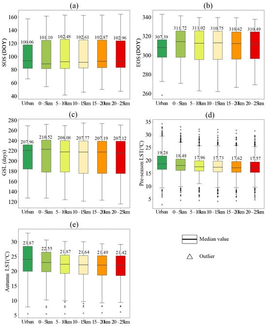 Box plots of (a) SOS, (b) EOS, (c) GSL, (d) pre-season LST, and (e) autumn LST along urban–rural gradient. Numbers on each box represent mean values. Top and bottom edges of each box represent 75th and 25th percentiles, respectively.