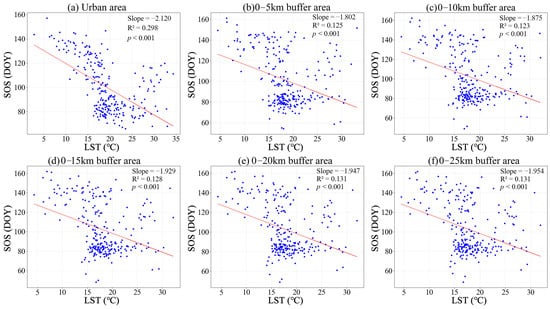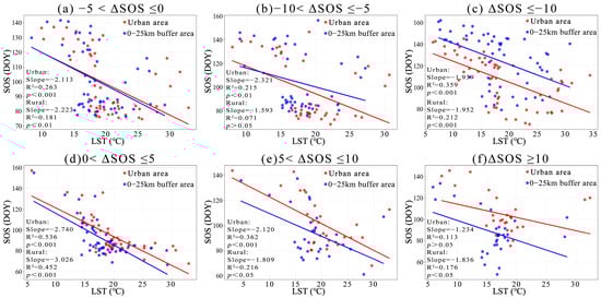 Scatter plots of the relationship between vegetation SOS and pre-season LST along various urban–rural gradients. (a) represents the urban area, and (b–f) represent the gradual expansion of the rural edges.