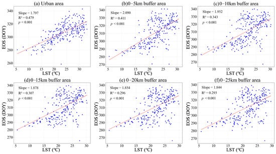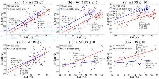Scatter plots of the relationship between EOS and autumn LST along various urban–rural gradients. (a) represents the urban area, and (b–f) represent the gradual expansion of the rural edges.