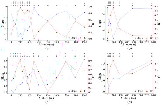 Linear regression parameters (R2 and slope) of SOS and EOS with LST along altitude gradient: (a) SOS vs. pre-season LST according to altitude grouping; (b) SOS vs. pre-season LST according to sample quantity; (c) EOS vs. pre-season LST according to altitude grouping; and (d) EOS vs. pre-season LST according to sample quantity. Notes: “*”, “**”, and “***” denote different significant levels at p < 0.05, p < 0.01, and p < 0.001, respectively; “-” denotes no significance.