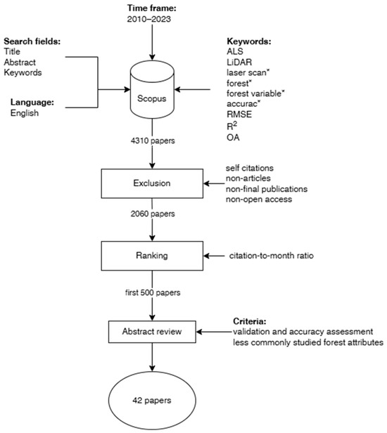 Then, these 2060 articles were ranked based on the ratio between their number of citations and the number of months since the publication date, and the first 500 articles were selected. Finally, the abstracts of the 500 selected articles were carefully read to focus further analysis only on those studies where ALS-based metrics—including both point- cloud-derived metrics (such as height and intensity percentiles) and ALS-derived forest attributes (such as estimates of forest biomass, structure, or biodiversity features)—were (i) followed by some degree of validation and accuracy assessment, either for regression or classification purposes, or (ii) applied to less commonly studied forest attributes (e.g., biodiversity-related variables). As a result, the present study focused on a total of 42 papers, published in peer-reviewed journals from 2010 to 2023 and satisfying the above detailed criteria (Figure 1).