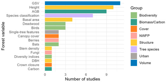 Number of forest variables assessed through ALS-based data, grouped into 8 macro-classes: biodiversity, biomass and carbon, forest cover, non-wood forest products (NWFPs), structure, tree species identification, urban environment and volume.