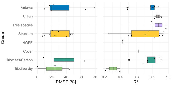 Distribution of RMSE% (on the left)—and R2 (on the right) of the grouped forest variables for the studies referred to in Table 1, where available.