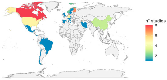 Number of reviewed studies per Country, based on the location of the area of interest.