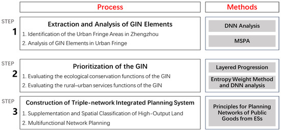 First, the scope of urban fringe areas in Zhengzhou was delineated using a DNN model based on multi-source data encompassing natural and socio-economic indicators. GI elements within the fringe areas were identified through MSP, and their distribution, classification, and ES output characteristics were analyzed, focusing on natural maintenance and rural-urban services. Next, we employed a public benefit output evaluation system to assess the current levels of natural conservation and urban-rural services provided by GI. This process identified land patches with potential for ecosystem service outputs, discerned the spatial patterns of associated ecological processes, and analyzed planning pathways that respond to the demands of both natural ecosystems and urban functions, ultimately determining priority areas for GIN development. Finally, by integrating the evaluation results of natural conservation and urban-rural services with the current land use classification, we classified and designed the three types of green infrastructure networks. Based on the overlay of the three networks, a GIN construction framework and implementation recommendations were proposed.