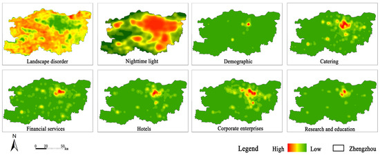 In the data selection for defining the urban fringe areas, we combined existing research and the structural characteristics of Zhengzhou, considering land use and socio-economic features as the main reference factors [12,25], and eight representative indicators are selected as the basic data. We characterize land use conditions using landscape disorder and nighttime light data, while socio-economic characteristics are represented by population data and five categories of Points of Interest (POIs). Landscape disorder effectively captures the homogeneity and heterogeneity of landscapes within a given area, quantifying the degree of landscape fragmentation. Compared to urban core and outer urban zones, the patch types in urban fringe areas are more complex and exhibit higher levels of landscape disorder. As a result, the land use characteristics represented by landscape disorder play a significant role in identifying urban fringe areas [12]. Nighttime light data objectively capture factors such as human activity and intensity [25], with urban fringe areas typically showing a notable decrease in light intensity and fragmented spatial distribution patterns. For the POI determination indicators, we selected five categories that have a significant impact on the identification of the fringe area: catering, financial services, hotels, corporate enterprises, and research and education. Figure 4 shows the pre-processing results of the above eight indicators.