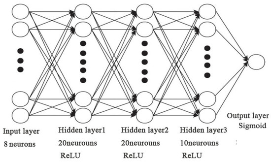 First, three types of spatial sample points (totaling 7892 sample points across Zhengzhou) were labeled based on normalized grid data of eight factors. Using remote sensing images and street-view photos, we selected 30% of urban points with distinct spatial characteristics as sample points, assigning values of 0.9, 0.5, and 0.1 as labels for urban core area, urban fringe area, and urban outer edge area, respectively. Second, 70% of the sample data were randomly selected as training data for the model, while the remaining 30% were used as testing data. Training was stopped when the error was controlled within 0.001 and the model meeting the accuracy requirements was saved. This model was then applied to fit all grid point data within the study area, with an 8-20-20-10-1 architecture ultimately adopted for this experiment (Figure 6). Third, the eight factors were used as eight input layer neurons in the DNN. The ReLU activation function was applied between the first three connected layers and the Sigmoid function was used as the activation function for the output layer. The model meeting the accuracy requirements was saved and used to fit all grid point data within the study area. Fourth, the category of each sample was determined by calculating the Euclidean distance between the output values of the test samples and the values 0.9, 0.5, and 0.1. The final test data accuracy of the DNN model was 93.1% and all point data were classified within the model to obtain the determination results. Finally, the result data were refined through interpolation to derive the spatial structure boundaries of urban fringe areas in Zhengzhou.