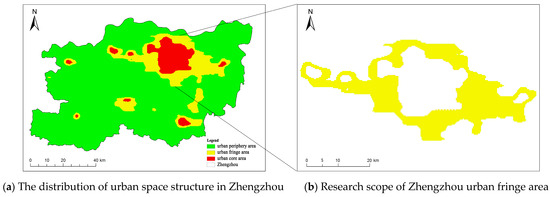 Figure 7a shows the division results of the spatial structure of Zhengzhou. The urban fringe areas covers approximately 901.48 km2, accounting for 11.99% of the total municipal area. The overall spatial structure of Zhengzhou exhibits a gradient distribution pattern, consisting of the urban core—urban fringe—urban periphery. The distribution characteristics of the urban fringe reflect the directionality and potential of urban expansion. To the west, it connects with the Shangjie District and Xingyang City, to the east, it links with Zhongmu County, and to the south, it extends towards Xinzheng City. Notably, urban expansion to the north has approached the Yellow River, where the fragmentation and loss of green spaces could significantly weaken the functionality of the ecological barrier along the Yellow River and threaten the city’s ecological security. As shown in the figure, Zhengzhou’s urban development follows a “one main, multiple secondary” pattern, with the main urban area as the primary core and surrounding towns as secondary centers. Based on this development model, this study focuses on the urban fringe surrounding the main urban area of Zhengzhou, considering the integrity and priority of spatial planning. The study area, as mentioned in the following text, refers to this specific region (Figure 7b). This area covers approximately 678.93 km2, accounting for 75.31% of the total urban fringe area of Zhengzhou.