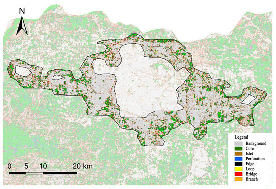 We classified and performed feature analysis on the habitat patches within the study area based on Morphological Spatial Pattern Analysis (MSPA), as a foundation for selecting GI areas. First, the land use data of the study area were reclassified using the Spatial Analyst module in the ArcGIS version 10.8 software platform. Second, ecological land and non-ecological land in the land use classification were separately designated as foreground and background, respectively, resulting in a binary raster image of GIN areas. Third, the raster data was set with a pixel size of 30 m × 30 m and after performing an eight-neighborhood analysis using the Guidos analysis software version 2.3, seven non-overlapping ecological landscape types were obtained, which served as potential elements of GIN in the urban fringe. Finally, the GI areas was analyzed in terms of both MSPA types and land use types.