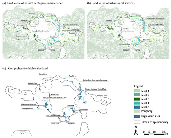 Figure 9 presents the evaluation results of the GI land value in the urban fringe of Zhengzhou, guided by public benefit outputs. Within the study area, high-output land (level 4 and above) oriented towards ecological conservation is predominantly distributed in forest land and water bodies (Figure 9a). High-output land (level 4 and above) oriented towards rural-urban services is mainly located along rivers and major transportation corridors. Along rivers, small riparian parks and forest land dominate, while along transportation corridors, green protective belts are the primary feature (Figure 9b). Comprehensive high-value public benefit outputs include the Xianghu Ecological Wetland Park, Diehu Park, Xiliu Lake Park, Changzhuang Reservoir, Jiangang Reservoir, and linear green spaces along certain rivers and transportation corridors (Figure 9c). The results indicate that the GI landscape types are relatively homogeneous and limited in number. Additionally, they are fragmented by construction land, failing to form a complete ecological network.