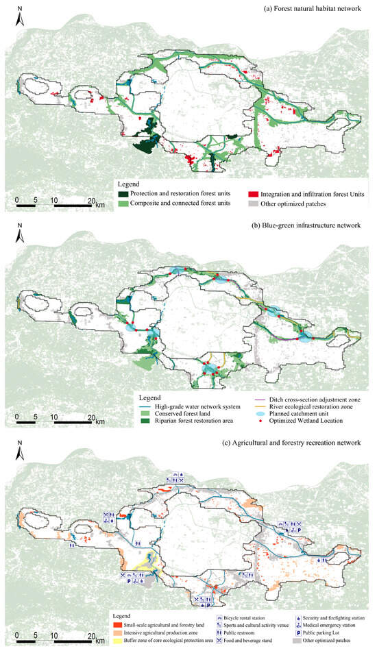 To ensure the structural integrity of the GIN and enhance the functionality of high-output GINs, we supplemented high-grade GI land (Figure 10a). On one hand, fragmented patches (such as islets, branches, and bridges) and non-construction land adjacent to existing high-grade land were integrated and designated as priority areas. On the other hand, in regions with a lack of high-grade land, such as the areas surrounding Xingyang, Shangjie, and Zhongmu, patches rated as level 2 and level 3 in the ecological conservation and rural-urban service evaluations were selected as supplements. Based on this, we spatially classified the GIN within the study area into the forest natural network, the blue-green infrastructure network, and the agroforestry recreation network (Figure 10b).