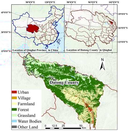 This study selected Datong County, China, as the main study area (Figure 1). Datong County is located in Qinghai Province in northwestern China, serving as a transition zone between the Tibetan Plateau and the Loess Plateau. The topography of the county is dominated by highland mountains, with abundant mountainous water systems and a wide distribution of ecological land and arable land. The forest coverage of the county reaches 43.3%, and the county is responsible for protecting more than 460 km2 of farmland. Therefore, the urban development of the county is subject to multiple constraints of natural conditions, ecological protection and farmland protection. However, as an important node city within the Lanzhou–Xining urban agglomeration and an important member of Xining–Haidong Metropolitan Area, Datong County has urgent construction and development needs at the same time. In 2020, the country’s per capita GDP surpassed USD 4300, the urban population reached 206,000, and the urbanization rate exceeded 51%. Therefore, how to improve the land use efficiency and optimize the land development layout to further promote the economic development of the county through reasonable land space planning, without compromising ecological protection and maintaining the protection of arable land, requires urgent research and resolution.