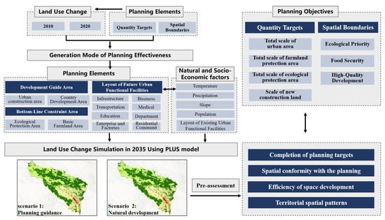 In this study, we systematically analyze the functional logic of planning elements in generating effectiveness and examine the driving mechanisms through which planning influences the evolution of regional spatial patterns. We also construct a land use change model that integrates key planning elements to simulate the spatial pattern of national territory by the final year of territorial spatial planning (2035). Then, we construct a planning pre-assessment system on this basis to quantitatively analyze the effectiveness of planning implementation. This research enables the prediction and evaluation of planning outcomes across multiple dimensions, while also providing practical and feasible suggestions for the formulation of territorial spatial planning.