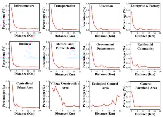 Figure 3 shows the change in the proportion of land use type conversions per unit distance with respect to the distance of each driving factor. It should be noted that the analysis here only covers the external conditions of each driving factor and does not include the land use changes inside the faceted driving factors. This is a result of the fact that the probability of construction and development is the highest of all areas in the urban development areas and village construction areas, which are the key construction areas in the future. In the protection areas, construction activities are strictly constrained and limited, and the probability of land construction changes is 0.