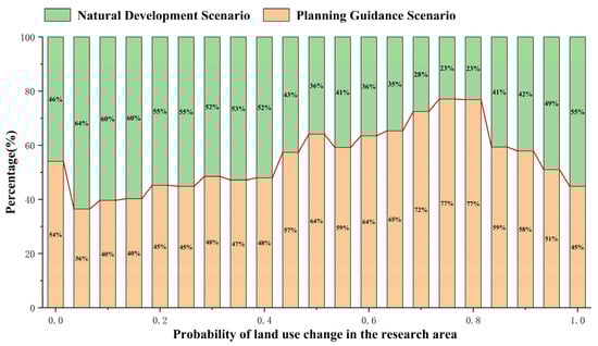 Based on the calculation results of each driving factor, we applied the LEAS module to explore the relationship between each driving factor and land use change in order to obtain the probability of each land use type conversion (Figure 5). Before the simulation analysis, the total probability of land conversion occurring in each patch is first compared and analyzed. Figure 6 shows the sum of the number of rasters in the study area with land use changes for all land use types as a proportion of the total number of rasters in the study area. From the results, the probability of land use type conversion occurring in the parcel under the natural development scenario is more distributed in the low probability range of 0.05~0.4. The number of rasters in this interval reaches 1,476,170, which accounts for 86.70% of the total number of all rasters with the possibility of development. Under planning guidance, the number of rasters in this range only accounts for 71.28% of the total number of rasters. Correspondingly, under the planning guided scenario, the number of rasters in the range of 0.5 to 1.0 where land use type conversion occurs is relatively higher, amounting to 364,037 rasters, accounting for 25.98% of all patches with development possibilities. In the natural development scenario, the proportion of rasters within the same range is only 11.63%. This shows that under planning guidance, the influence of various driving factors is more specific and the location of areas for potential development in the future is more concentrated.