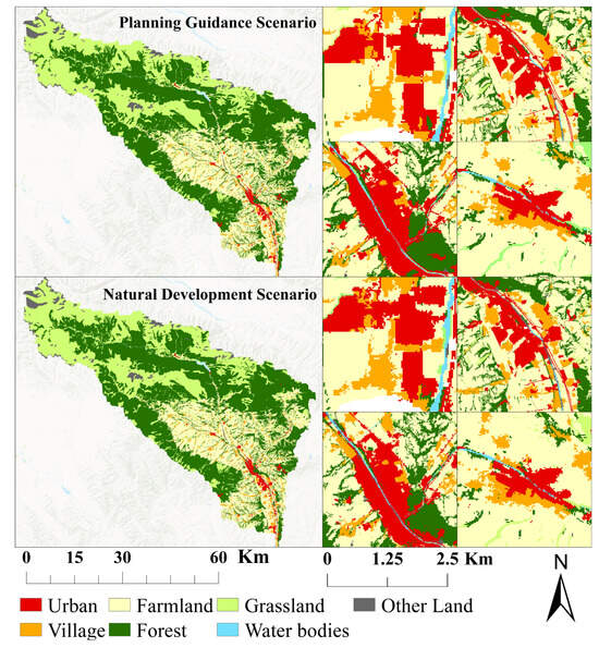 As for the spatial distribution and spatial pattern, from Figure 7, it can be clearly seen that under the guidance of planning, the distribution of patches within each land use type is more clustered. The boundaries of towns, villages, and other various land use types are straighter and clearer. In the case of natural development, the distribution of patches of each land use type is much more sporadic, with relatively small unit patches and more irregular shapes. Most of its borders are also more curved and tortuous. As a result, the functions of each land use type will not be completely exhibited, and land use efficiency will be significantly lowered.