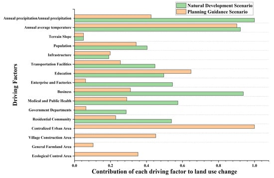 By analyzing the degree of contribution of each driving factor under different scenarios, we can obtain the role of each planning factor in future land use change. This calculation can be realized in the Land Expansion Analysis Strategy (LEAS) module of the PLUS model. The results show that under the planning guidance scenario, urban development is more guided by factors such as centralized urban area, temperature and layout of science, education, culture, and medical facilities, and this development pattern is in line with the actual law of urban development. Under the guidance of the centralized urban area, the urban development is further clustered in an orderly manner. The planned enterprises, factories, and other public infrastructures also greatly influence the layout of urban development. In addition, as the study area is located in the plateau region, the cities are more inclined to develop towards areas with higher average annual temperatures. In contrast, in the natural development scenario, natural factors such as temperature and precipitation dominate urban land use changes. Among existing infrastructures, only the commercial facilities have a more significant role in guiding urban development. This also reflects the fact that planned infrastructure is more attractive to developers and land users than existing infrastructure, and that planning scenarios for future urban development have a more significant impact on urban development (Figure 8).
