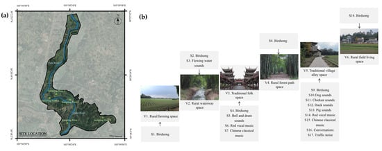 Figure 1. (a) The location of the study site in Dahe Village. (b) Audio–visual sample combinations in rural landscape. Note: The audio stimuli were encoded using audio–visual stimuli, and combinations of different photos with the same audio were also separately treated as audio–visual samples.