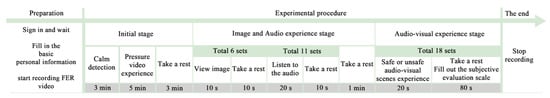 Before the experiment began, the research team provided participants with a detailed explanation of the overall procedure and collected their basic information. Participants were then given two minutes to familiarize themselves with the laboratory environment and equipment to ensure they felt comfortable and adapted to the experimental conditions before the formal experiment commenced. The formal experiment began with a three-minute calm detection phase. Subsequently, to induce emotional responses, participants watched a five-minute stress-inducing video known to significantly enhance facial expressions and psychological reactions [9]. After the video ended, participants underwent a three-minute break before proceeding to the formal stimulus testing phase. The testing phase consisted of two main parts: first, participants sequentially viewed six images and listened to eleven audio clips, with a ten-second interval between each stimulus; second, after completing the first part, they had a one-minute break before undergoing eighteen audio–visual combined-stimulus tests. After each audio–visual combined stimulus, participants had one minute to complete a rural perceived unsafety scale questionnaire. This process was repeated eighteen times, with each questionnaire corresponding to a specific audio–visual combined stimulus [61,62]. The completion of these questionnaires ensured that participants’ immediate responses were accurately recorded while providing detailed subjective evaluation data for subsequent analysis. The entire experiment lasted approximately fifty minutes, including a three-minute calm detection phase, a five-minute stress video, a three-minute rest period, and thirty-eight and a half minutes of audio–visual stimulus simulations, during which participants’ facial expressions were continuously recorded. Upon completion of the experiment, the research team shut down the equipment and saved all video recordings (Figure 2) [9,36,59]. Additionally, during the experiment, the research team selected the three-minute rest period following the stress test to remeasure each participant’s baseline data in a neutral state without visual or auditory stimuli, ensuring that individual differences could be accounted for in subsequent data analysis.