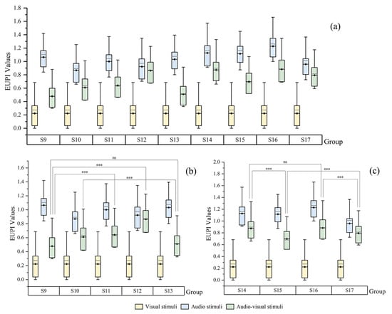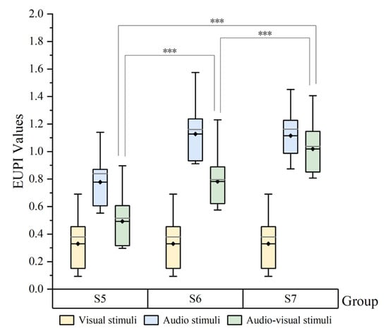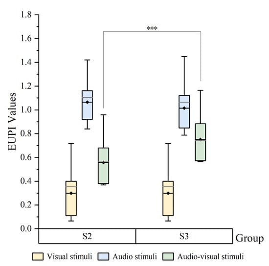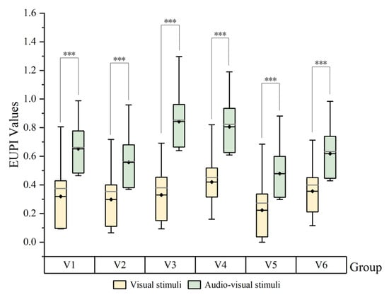 As illustrated in Table 1, the outcomes of the Kruskal–Wallis non-parametric test for independent samples indicate that visual, audio, and audio–visual stimuli across all spatial categories exhibited notable differences in EUPI values (p < 0.001). Moreover, Table 2 illustrates that within each spatial category, the EUPI values for visual, audio, and audio–visual stimuli also exhibited significant differences from one another (p < 0.001).