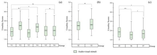 Figure 8. (a) Scores of rural perceived unsafety scale under audio–visual stimuli. (b) Scores of rural perceived unsafety scale in rural waterway space. (c) Scores of rural perceived unsafety scale in traditional folk space. Note: *** denotes p ≤ 0.001, * denotes p ≤ 0.05, and ns denotes p > 0.05.