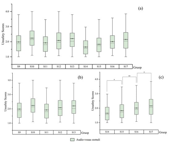 As shown in Figure 8b, there was no significant difference between the audio–visual stimuli S2 and S3. After adding audio stimuli, the overall perceived unsafety score exceeded 2.