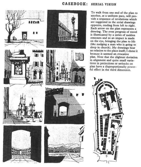 Cullen coined and introduced the concept of townscape on the basis that a city is more than the sum of its parts… which is one reason people like to live in communities’ and behoves us to try to understand ‘the visual impact which a city has on those who live in it or visit it’ [45]. He focused on how ‘townscape grounds itself in individual visual perception, treating the town as an object perceived by its inhabitants, fostering an art of relationship through concepts like serial vision, place, and content’ [49]. In effect Cullen saw the city as a series of urban spaces―Relph’s existential spaces―and ‘analyses the experiences we have of urban spaces from the perspective of the person in the street [in order] to establish the fundamental components of that experience, noting particularly the importance of serial vision, of places or centres, and of the content of those places’ [51]. To illustrate his ideas of serial vision and sequence of experiences, Cullen sketched a series of these spatial experiences―such as enclosure, precincts, and focal points―based on a plan with eight sequential movements from one space to another (Figure 4) in the direction marked by the arrows on the plan, thereby representing different human experiences of places. He then enlarges on this concept of spatial experience in an engaging series of examples highlighting aspects such as closed vistas, punctuation, narrowing, definition, and accessible outdoor rooms. Notably, the reader is presented with extensive examples of urban green landscape treatment at various scales from intimate to public. In this context Cullen can be seen as one of the planners, amongst others, who paved the way for developing worldwide scholarly interest in the critical role of urban open space systems and the need for a diversity of urban green spaces (UGS) which has taken place over the last two or three decades.