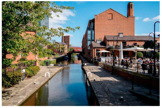 Reflective of the various characteristics of urban open spaces are two diverse but highly creative examples: (i) the rehabilitation in the UK of Manchester’s inner-city canals (Figure 6) and (ii) High Line New York (Figure 7a,b). The Manchester example is the work of The Canal and River Trust on the Rochdale Canal in the city centre. Figure 6 shows a section of the Rochdale Canal in central Manchester where waterside cafés, bars, restaurants, incidental tree planting, small parks and greening schemes have taken shape along the canal in a scheme dubbed ‘Manchester—Venice of the North helped make our city and are key to its booming future’15.