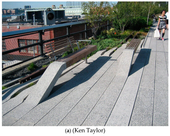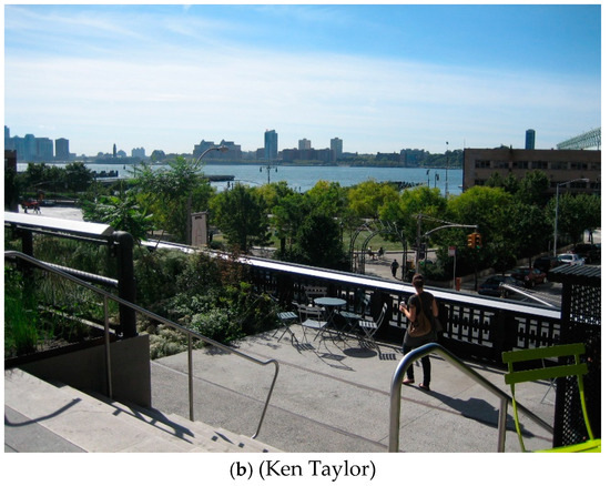 Since opening in June 2009, the High Line has become a prominent landmark of American contemporary landscape architecture. The High Line’s success has inspired cities throughout the United States to redevelop obsolete infrastructure as public space. The park became a tourist attraction and spurred real estate development in adjacent neighbourhoods, increasing real-estate values and prices along the route. By September 2014, the park had nearly five million visitors annually, and by 2019, it had eight million visitors per year (https://en.wikipedia.org/wiki/High_Line, accessed on 5 March 2025). One of the attractions of this elevated park as a linear roof garden is the varying views it affords out across the city and its setting (Figure 7b).