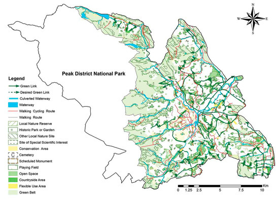 Green network within the Sheffield Local Planning Authority boundaries. The digital map of the GN was obtained from the SCC Parks and Countryside Service in 2014 (Ersoy et al., 2019, p. 930, Figure 3 [56]).