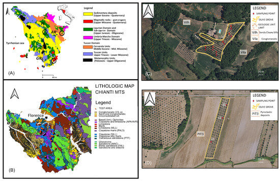 (A) Schematic geologic map of the Tuscany region, Italy. The different geochemical environments of the olive groves where the soil samples were collected are highlighted in black numbers, located in the following: (1) Chianti area (Florence—FI), (2) Alta Valtiberina (Aghiari, Arezzo—AR), and (3) Maremma (Pitigliano, Grosseto—GR); (B) Lithologic map of the Chianti Mts with the soil sampling sites (TEST AREA) collected in the Greve Basin; (C) Orthophotos (2023 year, Regione Toscana, Geoscopio WEB GIS) showing the sampling point distribution for the Anghiari olive grove; (D) Orthophotos (2023 year, Regione Toscana, Geoscopio) showing the sampling point distribution for the Pitigliano olive grove.