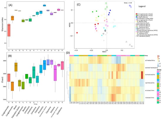 We initially examined the relationship between soil geochemical characteristics and the diversity of bacterial community structure using the soil bacterial alfa and beta diversity indexes. Our results indicated different diversity patterns (Shannon index) based on the geochemical environmental: higher for pyroclastic-derived soil and lower for conglomeratic-derived soil (Figure 2A). A significant difference in the bacterial richness (Chao1) between the claystone lithologies and limestone was observed, which revealed a notable higher bacterial richness in varicolored claystone compared to the Palombini shales or conglomeratic soils (Figure 2B).