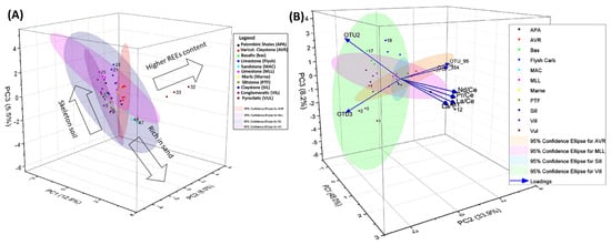 Bacterial species richness within a single geochemical environment, that is, the α diversity indices of the soil bacterial community, was calculated by the Chao1 index, which is sensitive to rare species [31], and the Shannon index. Comparison of the abundance differences of species between groups (topsoil developed in different geochemical environments) under different taxonomic levels was calculated by MetaStat tests. Diversity in the bacterial community related to different geochemical environments was evaluated considering the bioavailable fraction of REEs and performed by principal component analyses (PCA). The PCA was applied in covariance modes that indicate the direction of the linear relationship between variables and how they vary and in correlation mode that measures both the strength and direction of the linear relationship between variables (OriginPro, Version 2024. OriginLab Corporation, Northampton, MA, USA). In this study, the REEs were used as a tool to trace the natural geochemical evolution processes of different geological settings, mostly sedimentary systems, that differ for their biogeochemical and microbial signature. The present study used information on the spatial distribution of REEs and their relationship with different geochemical environments and bacterial composition generated by the authors’ previous studies [2,17].
