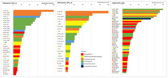 To test whether local and landscape environmental heterogeneity characteristics affect Actinobacteria distribution in soils, we applied a random forest (RF) model. We used the RF model to assess the variable importance and, hence, to reduce complexity, selecting the most important variables. The results of the RF analysis revealed that geomorphometric factors accounted for a different proportion of the variance in soil Actinobacteria (Figure 4). For Microlunatus (OTU3), the influence of their interactions with the other Actinobacteria and geomorphometric descriptors was stronger than the influence of geochemical spatial descriptors (Figure 4). Conversely, for Gaiella (OTU354), microbial communities were associated with geochemical covariates such as the Sb (antimony) chalcophile element above 45%, the Mo (molybdenum) siderophile element higher than 35%, and the Al (aluminum) lithophile element above 30%. Considering soil nutrients such as phosphorus was less influential, with 13% of the explained variance. The geomorphometric predictors CND (84%) and elevation (DEM 49%) showed higher predictive importance for Gaiella (OTU354) than Rubrobacter and Microlunatus genera. The hydro-morphological characteristics of the soil landscape, TWI (49%), TPI (30%), and NDWI (11%), showed higher importance for Microlunatus (OTU3). Moreover, this genus was highly related to the multispectral reflectance of the vegetation (NDVI > 40%). RF also indicated a strong link between the Rubrobacter genera (OTU2), Microlunatus, and Gaiella, suggesting a co-occurrence network. In fact, OTU2 showed a higher importance variable value (from 64% to 82%) for predicting Microlunatus and Gaiella, respectively. Moreover, for OTU2, the lithophile elements, Li (Lithium) and Ni (Nickel), showed an importance of 28% and 17%, respectively. Furthermore, the occurrence of the OTU2 is connected to the presence of the chalcophile elements strontium (17%) and calcium (15%).