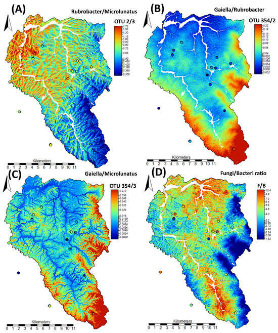 Spatial prediction of biomarkers: (A) Rubrobacter/Microlunatus, (B) Gaiella/Rubrobacter, (C) Gaiella/Microlunatus, and (D) fungi/bacteria ratio for a Mediterranean landscape dominated by ancient olive groves, Greve Basin, Tuscany, Italy.