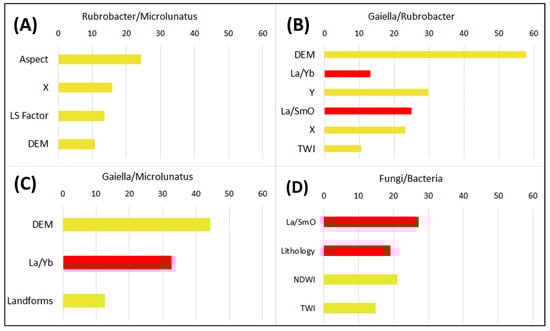 Multiple regression analysis predicted importance of soil Actinobacteria: (A) Rubrobacter/Microlunatus, (B) Gaiella/Rubrobacter, (C) Gaiella/Microlunatus and (D) fungi/bacteria ratios. Legend: topographic wetness index (TWI), digital elevation model (DEM), length slope factor (LS factor), normalized difference water index (NDWI), lanthanum/ytterbium (La/Yb), and lanthanum/samarium olive fruit (La/SmO).