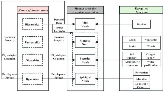Human needs can alter the ecological environment, while the ecological environment, in turn, can affect the fulfillment of human needs. A large body of literature focusing on human needs addresses socioeconomic [31] and ethical issues [32], such as poverty, social welfare, social exclusion, and human rights. Research on human needs is abundant in the fields of philosophy (from early Greek philosophers to Marx, Rawls, or Habermas), sociology [33], psychology [34], and economics [35]. Many studies discuss various aspects of human needs at the theoretical level, but there is a lack of research on the relationship between human needs and ESs; quantifying human needs is a major challenge in the academic community.