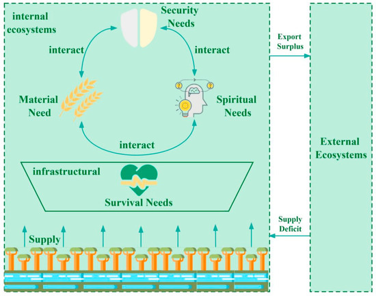 In this paper, the degree of satisfaction of needs is discussed, and these needs are valued on the basis of the connotations of various human needs. These values are subsequently compared with ES values. The coupling relationships between human needs in the study area are discussed, and an exploration is undertaken regarding which human needs in the study area can be self-sufficient and outwardly fulfilling and which human needs cannot be completely met without external inputs. Figure 2 illustrates the theoretical framework of this paper. Human life needs are considered the most basic requirements and prerequisites for other needs. If an ecosystem cannot support human life needs, there should be no human activities in that area, and the supply of ESs for human needs should be absent. Therefore, life needs are assumed to be always met and cannot flow between regions. When discussing the coupling relationships between human needs, the relationships between life needs and other needs are not considered.